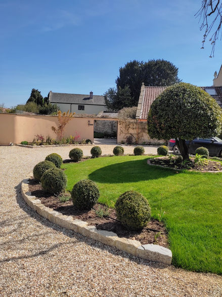 Re-design and build of the entrance garden for striking country house, including circular feature bed, boarders and patio